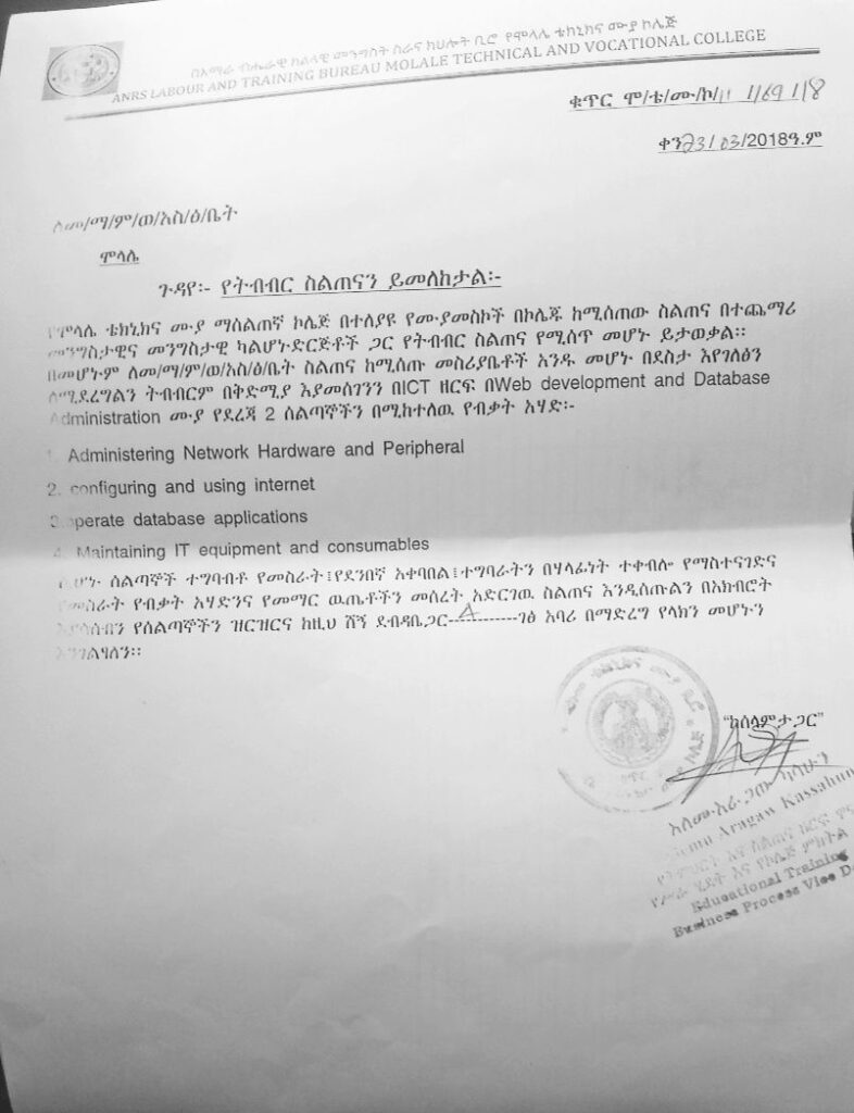 የሞላሌ ቴክኒክና ሙያ ኮሌጅ ተማሪዎች የትብብር ስልጠና በመንዝ ማማ ምድር ወረዳ አሰተዳደር ጽ/ቤት በኢንፎርሜሽን ኮሙኒኬሽን ቴክኖሎጂ ቡደን የኮደርስና ሌሎች ተዛማጅ ስልጠናዎችን እየወሰዱ ይገኛሉ፡፡ ሥልጠናውንም የቡድኑ የኔትወርክ አስተዳደር ባለሙያ የሆኑት አቶ ደበበ ባህረ እየሰጧቸው ይገኛሉ፡: